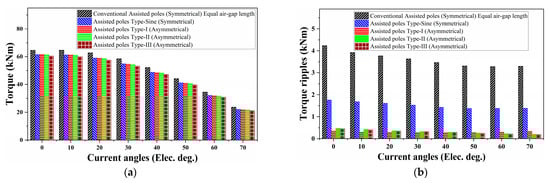 The torque performance under different current angles is presented in Figure 14 for the spoke-type PMSM with symmetrical and asymmetrical assisted-poles. Figure 14a presents the torque, while Figure 14b presents the torque ripple performance under different current angles. Here, it can also be observed that the spoke-type PMSM designed according to the proposed asymmetrically designed assisted-poles arc-ratio significantly reduces the torque ripples, validating the proposed method.
