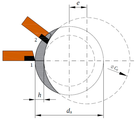 In our previous study [10], a screw for a small dry extruder used to process soybeans was made utilizing a universal lathe with a whirling attachment, and the surface quality was measured. The cutting tool was a carbide-tipped insert mounted on a specially designed cutting head of the whirling attachment. The charge on the cutting head, the rotational speeds of the tool and the workpiece, and the feed rate and cutting depth were adjusted by the required screw dimensions. As Figure 1 shows, the tool first touches the workpiece (position 1) and then moves toward the center by a distance equal to the thread height h (position 2).