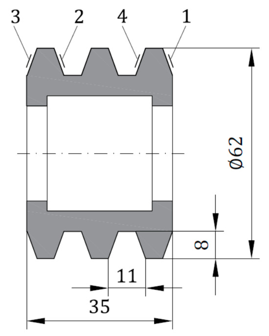 The main cutting motion of the whirling device was performed by a 1.1-kW electric motor that transmitted the rotating movement at the whirling thread-cutting device using a SPA-type V-shaped belt. Stretching of the belt was carried out via the egg-shaped holes through which the electric motor was fixed on the case of the whirling attachment. The V-belt pulley of the electric motor on the thread whirling attachment had a diameter of 94 mm. The driven pulley, mounted on the inner side of radial roller bearings along with the tool-cutting ring, had a diameter of 140 mm. Four cutting speeds were used for machining, and a frequency converter was utilized. Each blank was placed on the mandrel and tightened using the three-jawed chuck of a Böehringer lathe (Figure 3).
