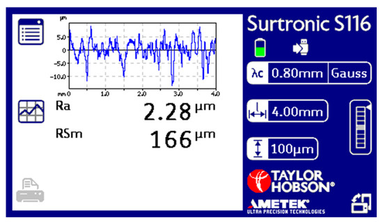 Roughness was measured using a Surtronic S-116 device (Taylor Hobson) at a screw profile length of 4 mm. The instrument can measure roughness in any orientation within 25 mm of the evaluation length. In addition to roughness data, it is possible to measure waviness parameters, parameters on the raw profile, and parameters obtained by double filtering. The instrument resolution and reading accuracy are 0.01 μm and 2%, respectively. Before the measurement, the instrument was calibrated using a reference specimen type 112/534 with 6.0 μm roughness. An example of the measurement is shown in Figure 7. A Gaussian filter was used for the measurement.
