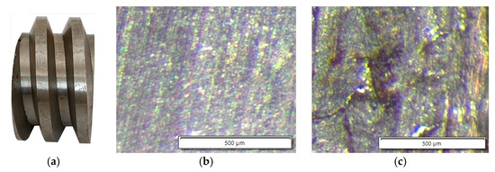 The machined surface was observed using a stereo microscope Olympus SZX 10, with two apochromatic objective lenses (Figure 9b). The surface of the screw made by whirling had a much lower roughness compared with the screw made by turning (Figure 9c).