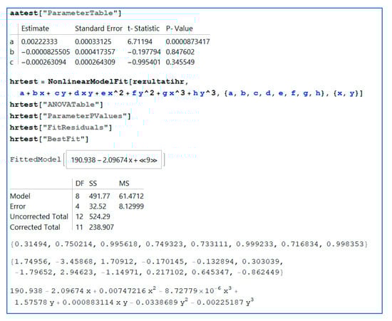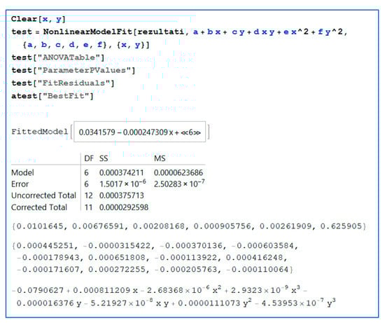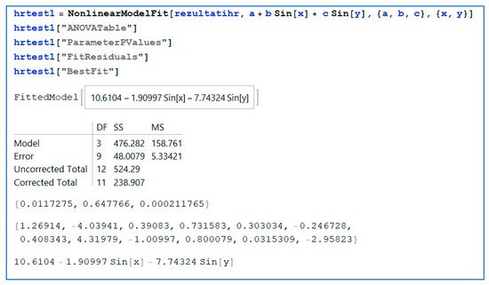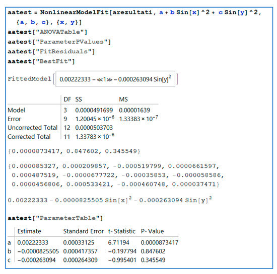 Figure 10, Figure 11 and Figure 12 show the code for the analysis of variance (ANOVA) test for each data set or matrix. Matrix rezultati stores the analyzed vibration data from sensor 1, matrix arezultati stores the analyzed data from vibration sensor 2, and matrix rezultatihr stores data from the surface roughness analysis. With the appropriate function (NonlinearModelFit), ANOVA was performed; the ANOVA table, parameter p values, and residuals were extracted for each prepared set of data.