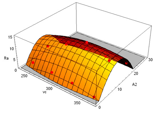 In a similar manner, the Ra value for surface roughness was determined; the response surface is shown in Figure 14. For simplicity, physical units on the following graphs are omitted and can be identified using Table 6.