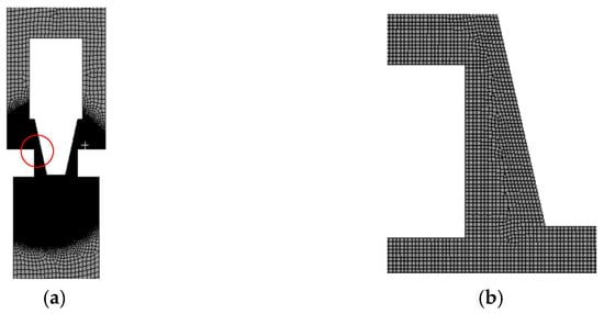 Due to the axisymmetric structure of the valve core and internal flow channel, 2D simulation was used in this study. The ANSYS Mesh 18.0 software is used to generate the mesh of the throttle valve model. In order to improve computational accuracy, the mesh of the valve throat position is encrypted, as shown in Figure 2. Figure 2b is the enlarged image of the encrypted grid shown in red circle in Figure 2a.