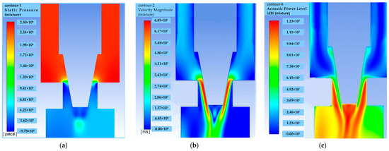 The simulation result diagram of the throttle valve: (a) the pressure cloud map; (b) the velocity cloud map; (c) the broadband noise sound field.