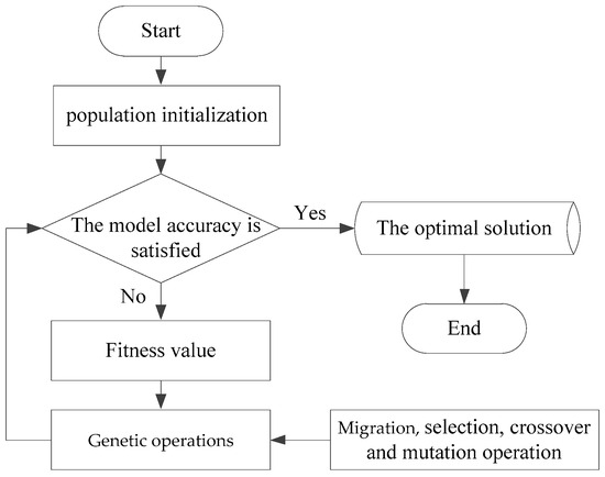 In order to obtain the global optimal parameter group, the MIGA is used to optimize the approximate model of the water hydraulic throttle valve’s parameters. A genetic algorithm is a global optimization algorithm developed by simulating the biological genetic and evolutionary processes in nature [23]. MIGA is an improved intelligent algorithm of genetic algorithm. MIGA has a strong global optimization ability and higher computational efficiency [24]. The main feature of MIGA is that a large population is divided into several subpopulations, namely “islands”, and the subpopulations on each “island” are optimized by a genetic algorithm. Therefore, the MIGA will conduct population individual exchange between “islands” and “islands” [25,26]. The main process of MIGA is shown in Figure 7.