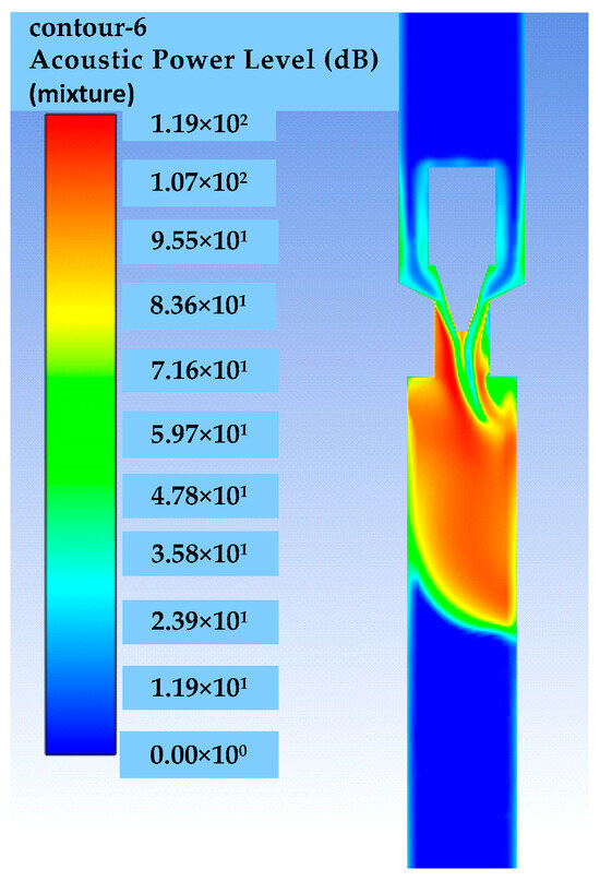Figure 3c is the broadband noise of the throttle valve. From Figure 3c, it can be seen that the high noise levels are mainly concentrated in the area near the throttle throat. Therefore, the parameters of the throat structure, such as the half angle, throat inlet angle and throat length, can significantly affect the noise of the throttle valve.
