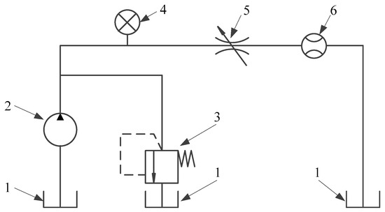 Experimental principal diagram of the throttle valve noise testing system. 1—water tank, 2—piston pump, 3—relief valve, 4—pressure gauge, 5—throttle valve, 6—flow meter.