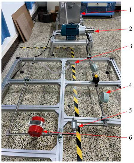 The experimental platform of the throttle valve noise testing system. 1—water tank, 2—piston pump, 3—relief valve, 4—pressure gauge, 5—throttle valve, 6—flow meter.
