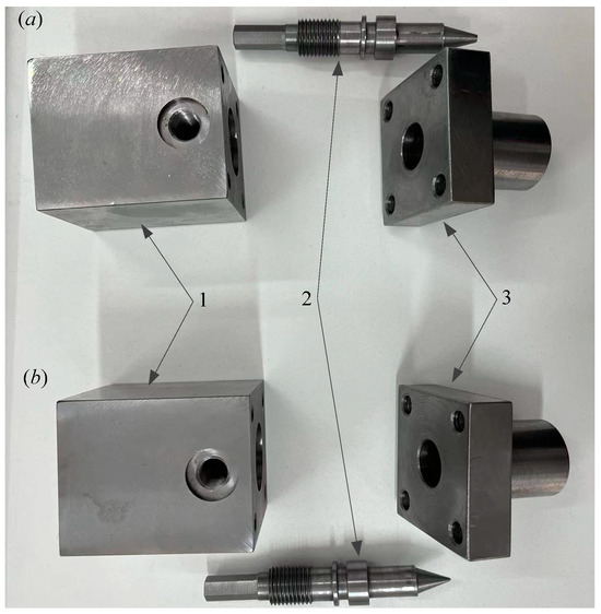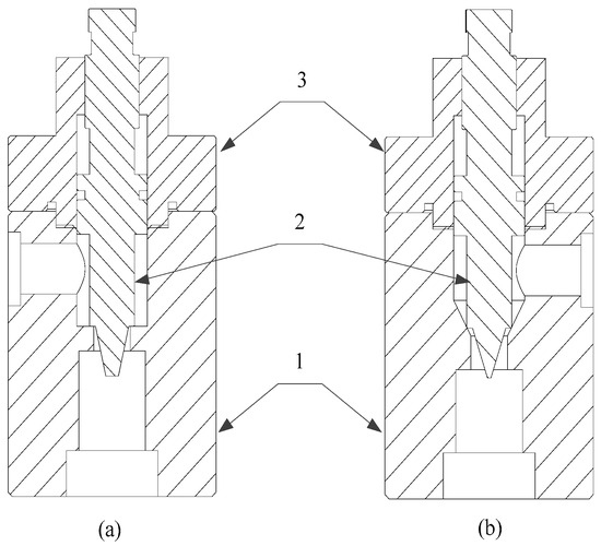 The original and optimized water hydraulic throttle valves that have been manufactured: (a) original; (b) optimized. 1—valve body, 2—valve core, 3—end cover.