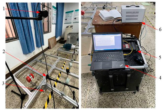 The water hydraulic throttle valve noise experimental bench. 1—microphone 1, 2—microphone 2, 3—water hydraulic throttle valve, 4—the acquisition system, 5—computer, 6—DC power supply.