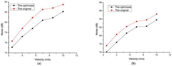 When the throttle valve opening is the same, and the measurement conditions are the same, the trend of the noise of the original and the optimized throttle valve under different velocities is consistent. By comparing the simulation results curve in Figure 4, it can be seen that the trend of simulation noise and experimental noise is basically consistent. However, due to the presence of environmental noise and hydraulic system noise, there is a certain difference in numerical values between simulation noise and experimental noise.