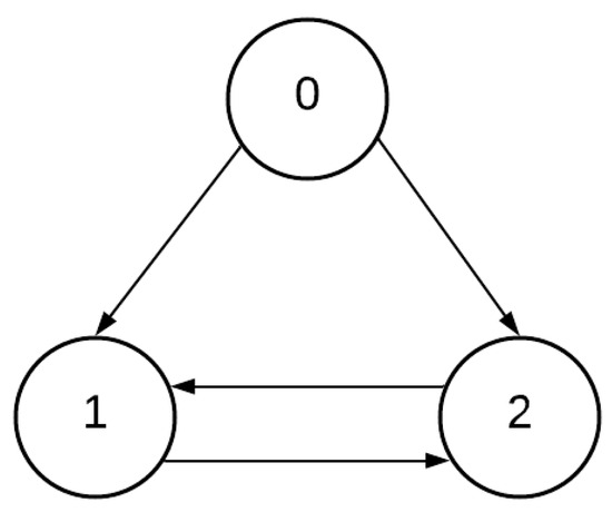 A numerical simulation was performed to validate the performance of the control scheme based on an unknown input observer for the formation flight of three UAVs. For this formation, consider the communication graph in Figure 2, where node 0 is associated with the leader agent and the other nodes are associated with the follower agents. Then, the Laplacian matrix of the graph is defined as follows: