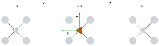 The formation structure is shown in Figure 3, where the followers (gray) have a distance of m in the y coordinate from the leader (red). Therefore, because the leader is the origin of the formation, the vector . For the follower agents, constant vectors that describe the formation structure are .