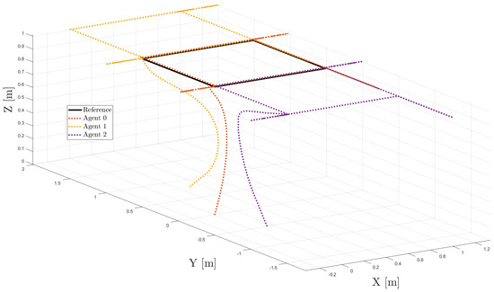 We consider a leader–follower strategy for the formation control of the MAS. The system has the scheme shown in Figure 1, in which it is considered that the quadrotors are underactuated systems. For all agents, the coordinates , , , and can be controlled directly and individually, without sharing information between the vehicles. At the same time, the translational movement is conducted in a coordinated way.