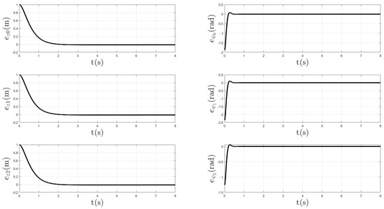 Tracking errors in x, y, and coordinates are shown in Figure 7. It is appreciated that there are peaks in the errors due to the reference changes and the presence of time-varying delays. However, the proposed scheme caused the error to converge to zero, despite the presence of distinct unknown delays.