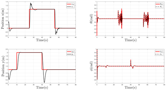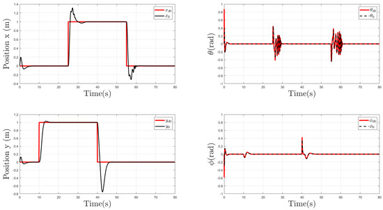 Figure 9 shows the behavior of follower Agent 1. We can observe that it is evident that the input time-varying delay impacted the follower more significantly than the leader. The trajectories of x, y, , and remained unaffected, except when the desired position changed. Moreover, the x coordinate was more affected by time-varying delays than the y coordinate; the reason for this behavior was that, during the time intervals when the x coordinate changed position, the functions , and had periods of greater amplitude, as shown in Figure 5, thus resulting in a more significant delay in the control input.