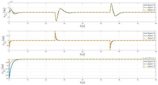 In Figure 11, the estimation errors between and of all agents are depicted. It is evident that the error approached zero, indicating the convergence of to . Finally, Figure 12 shows the estimation errors between and of all agents, we can see that the proposed algorithm caused the error to converge to zero; thus, the effectiveness of the designed control schemes based on state estimation was verified by isolating these errors in all agents, despite the presence of distinct unknown delays.