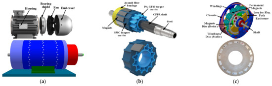 Figure 3. State-of-the-art composite materials applied in electrical machines: (a) Application of PA6GF30 30% glass fiber-reinforced polymer in the motor casing to reduce motor weight [11]; (b) A lightweight rotor made of composites and steel [16]; (c) An axial flux plastic multi-disc brushless PM motor for a stratospheric unmanned aircraft [31].