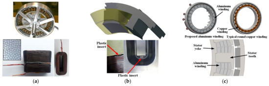 Figure 4. State-of-the-art aluminum windings used in electrical machines: (a) A propulsion motor using pre-compressed aluminum stator windings for a solar-powered aircraft [35]; (b) A new method of fabricating pre-compressed aluminum windings using stranded/Litz wire [36]; (c) A design of high slot fill aluminum winding in PM machines for reducing winding losses [37].