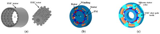 Figure 5. Some typical SMC applications in electrical machines: (a) A PM transverse flux motor with SMC cores [41]; (b) A novel flux reversal claw pole machine with SMC cores [42]; (c) A PM claw pole machine with hybrid cores [43].