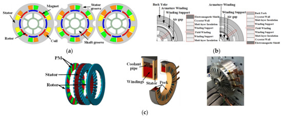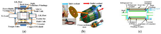 Figure 6. Some state-of-the-art SEMs: (a) A lightweight fully SEM for electrical aircraft propulsion system [46]; (b) A double rotor flux switching machine with superconducting field coils and thermal management system [47]; (c) A 10 MW fully superconducting synchronous generator with REBCO superconducting tapes for electric aircraft [48].