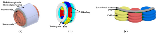 Figure 9. State-of-the-art coreless or ironless electrical machines: (a) A coreless multi-phase electric machine using magnetic resonant coupling [59]; (b) A high-speed axial-flux PM machine with a Halbach-array PM rotor and an ironless stator [60]; (c) A coreless multidisc axial flux PM machine with CNT windings [61].