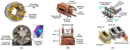 Figure 11. State-of-the-art additively manufactured windings in electrical machines: (a) A novel shaped profile coil with direct cooling channels [67]; (b) Windings enabled by additive manufacturing for direct thermal management [68]; (c) Additively manufactured hollow conductors integrated with heat pipes [69].