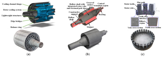 Figure 12. State-of-the-art additively manufactured cores in electrical machines: (a) An additively manufactured air-cooled lightweight rotor for automotive electric machines [70]; (b) An additively manufactured lightweight rotor made of soft magnetic silicon alloy [71]; (c) An additively manufactured stator with Hilbert pattern for axial flux machines [72].