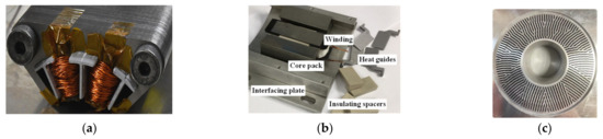 The thermal issue has consistently been one of the most critical concerns in motor design, and additive manufacturing is being adopted to address this challenge by enabling more integrated and efficient cooling configurations. To enhance winding direct cooling, a specific heat exchanger with unique geometry enabled by 3D printing technology is proposed in Figure 13a for high-power density motors and integrated into double-layer concentrated windings [73]. Compared to other materials, ceramic materials are characterized by high thermal conductivity, high stiffness, and strength at extremely high temperatures. After experimental validation in a motorette, a continuous DC current density of 35.7 A/mm2 is achieved, thereby enabling the attainment of a power density of 12.1 kW/kg in the reference motor. Another similar investigation in Figure 13b involves the implementation of thermally conductive heat guides as a novel heat dissipation approach to provide an efficient cooling path in machines [74]. Additive manufacturing technology is employed to fabricate the heat guide with complex geometry, resulting in improved thermal performance and minimized losses, while remaining unaffected by external magnetic fields. The test results demonstrate a reduction of 30% and 40% in temperature rises at both the winding end and active area, along with an 85% improvement in heat dissipation efficiency. Remarkably, the contribution of heat guide to the total weight of stator winding assemblies is only 3% to 4%, which significantly enhances power density. Apart from motor windings, 3D-printed cooling configurations can also be integrated within other motor regions to improve thermal performance. An additively manufactured heat exchanger with a multi-finned structure is integrated within the original internal space to address the overheating issue in the stator components of outer-rotor motors, as shown in Figure 13c [75]. The proposed cooling configuration enables a temperature reduction of 9.1 K to 18 K under various conditions compared to conventional heat sinks. Furthermore, the temperature gap between the windward and leeward sides has also been narrowed, which is beneficial for the thermal management of the entire motor.
