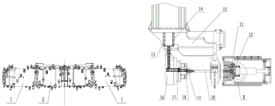 The internal spraying system of mining anchor-digging equipment is a technical device used for adsorbing and settling dust on the underground mining face, reducing the temperature of the cutting teeth, and eliminating sparks, with the effect of improving the visibility of the working face, improving the working environment, and increasing the service life of the equipment. Because of its need to cut coal rock, its working speed is generally around 20–50 rpm. It has a rotating water seal diameter, problems with short service life, and the transverse axis of the retractable drum-digging anchor-integrated machine is due to the structural design of the outer rotor, where the retractable cylinder needs to provide a hydraulic oil pipeline. This special mechanical structure design causes difficulties with the outer rotor drum as well as the internal runners into the water [1]. The structure of the transverse telescopic cut-off drum and the internal piping is shown in Figure 1. Inside the speed reducer, there are two hydraulic channels: the extension channel (13) and the retraction channel (14), which make it impossible for the internal spray system, which is located under the cut-off drum teeth, to feed water from the outer drum.