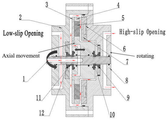 Figure 2. Permanent magnet eddy current drive-switching seal structure (1. water inlet, 2. left flange, 3. magnetic disc backplane, 4. magnetic holding disc, 5. permanent magnet array, 6. conductor disc backplane, 7. copper disc, 8. right flange, 9. right dynamic ring, 10. right stationary ring, 11. left stationary ring, 12. left dynamic ring).