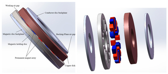 The structure of the permanent magnet drive of the switching seal is shown in Figure 2 and Figure 3. The magnet disc assembly consists of permanent magnets, a stainless steel frame, and the backplane of the magnet disc, with axial movement. Permanent magnets with north–south pole alternation are axially magnetized in a fan-shaped distribution along the circumference. The conductor disc assembly consists of the copper disc and the conductor disc backplane. There is a second air gap between the copper disc and its backplane, which is called the backplane air gap. The holding discs of the conductor disc assembly and magnet disc assembly consist of austenitic stainless steel that is not magnetically conductive and is intended to minimize the influence of other metal parts that may be ferromagnetic on the permanent magnet drive structure.