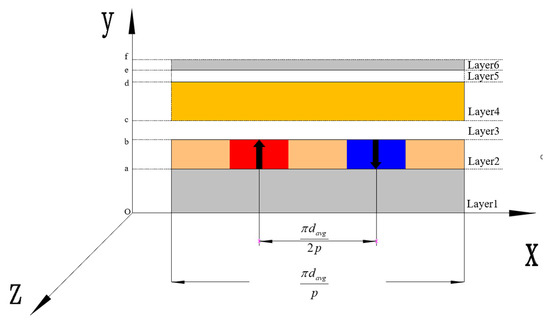 The structure model of the permanent magnet drive of the switching seal was unfolded along the circumferential direction into a linear model, and the model was truncated axially, resulting in a two-dimensional linear model in Cartesian coordinates (Figure 5). The transformed 2D linear model can be divided into six different layers: