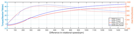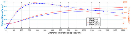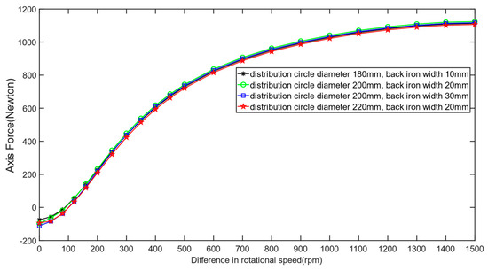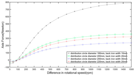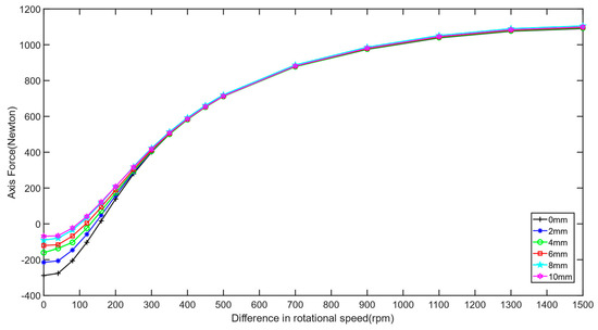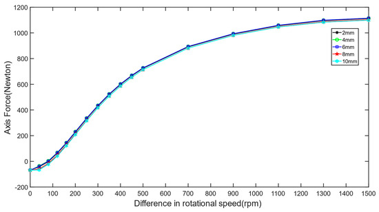 Figure 27. Difference in rotational speed—axial force curves per unit area of the conductor disc backplane.