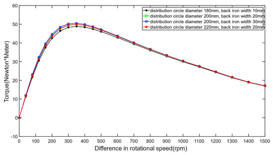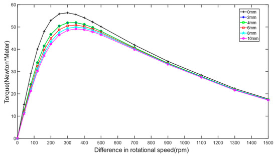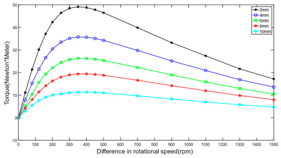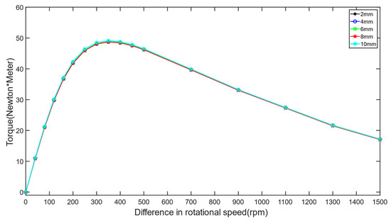 Figure 21. Torque—slip characteristic curve of the permanent magnet eddy current structure vs. backplane thickness.