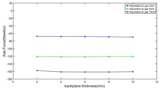 Figure 23 shows the relationship between axial force and different conductor disc thicknesses at various backplane air gaps. It can be observed that the axial force applied to the magnet disc is related to the size of the backplane air gap where the conductor disc backplane is situated, and it is not dependent on the thickness of the conductor disc backplane. When the backplane air gap is smaller, the axial force applied to the magnet disc is greater.