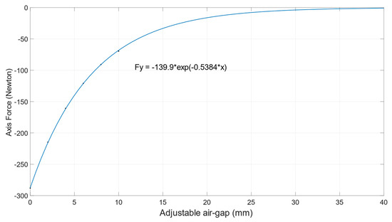 Thus, as shown in Figure 24, in the static state, the attraction of the magnet disc assembly by the conductor disc backplane is only related to the thickness of the adjustable air gap, which tends toward 0 as this air gap increases, with the relationship approximated by F y = 139.9 e 0.5389 x .