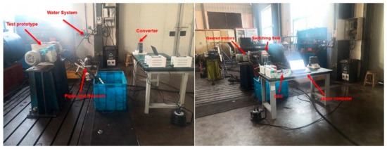 The test system was designed as shown in Figure 28, and its component equipment and key parameters are shown in Table 4. The test principle was to control the speed of the gear motor through the frequency converter and manually control the pressure and flow of the water supply system. In the left seal and the right seal at the outlet pipe, we set up a vibration-resistant pressure gauge, pressure sensors, and flow sensors, and used an adjustable DC power supply to power the sensors; the collected data were routed through the USB-6008 DAC to the host computer.