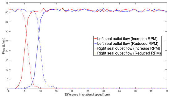 In Figure 29, the speed–flow diagrams of the two seal outlets are shown when the speed increases from 0 to 50 rpm and then decreases from 50 rpm to 0 rpm. It can be seen that, during the rotation speed-up phase, the switching seal changes from the cylinder condition to the internal spray condition at about 5 rpm, while during the rotation slow-down phase, the switching seal changes from the internal spray condition to the cylinder condition at about 10 rpm. The reason for this difference in speed between opening and switching is the influence of the working air gap. The permanent magnet eddy current structure of the switching seals has a working air gap of 2 mm when the left seal is closed, at which time the axial force and torque are larger (see Figure 15, Figure 17 and Figure 18), whereas when the right seal is closed the working air gap is 4 mm, and at this time the axial force and torque are smaller compared to the left seal closure condition (see Figure 16, Figure 17 and Figure 18). This difference in speed between the switching conditions also verifies the correct analysis of the transmission characteristics of the permanent magnet eddy current structure.