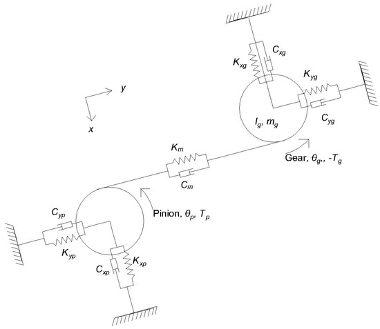 The healthy gear model always serves as a baseline for any failure model. It is useful to understand the dynamic response of the healthy gear to ascertain the deviations that may be observed in faulty gears. The lumped parameter method is used for obtaining analytical dynamic models [35]. In a one-stage gear system, an analytical dynamic model with 6 degrees of freedom (DOF) can define two translational directions and one rotational direction for the pinion and the gear. The schematics of the model and its equations of motion as detailed in [36] are presented in Figure 2 and Equations (1)–(6).