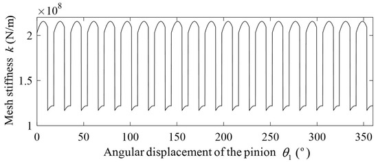 The time-varying mesh stiffness is considered a source of gear excitation and itself can be used to observe changes in gear excitation pattern [43]. The TVMS for a healthy gear is in the form shown in Figure 5 [44].