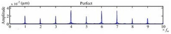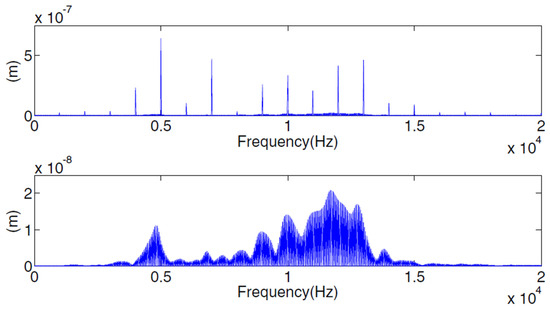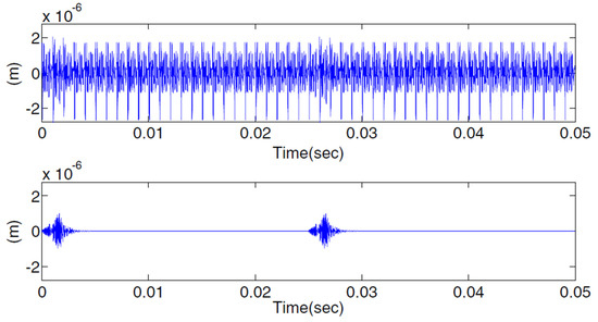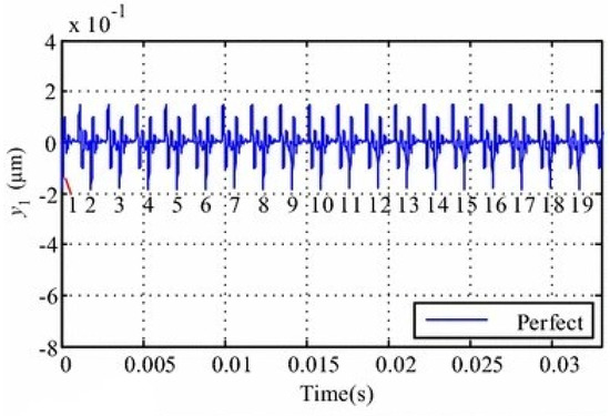 With the values of Km and Cm obtained, equations of motion for the gear system of any degree of freedom can be solved and the dynamic response obtained. Many researchers have obtained the solutions using ODE45 or ODE15s in MATLAB [39,45]. The dynamic response in the form of displacement signals of the motion as the gear rotates for the healthy state in the time and frequency domains as presented in [45] are shown in Figure 6 and Figure 7. In Figure 6, the 19 spikes corresponds to the number of teeth of the pinion, all spikes are even as there are no faults. The red line indicates the position of the first spike.