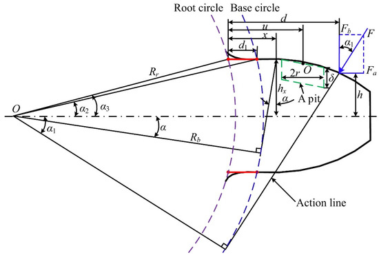 To calculate the time-varying mesh stiffness, the changes caused by the area where pitting has occurred would be noted. To analyze the TVMS, the values of the change in length, change in area and change in area moment of inertia caused by the pitting fault must be calculated. This is used to obtain the fault state mesh stiffness. The equations for evaluating the changes in the contact length, area, and area moment of inertia as detailed in [45] are shown in Equations (19)–(21). Figure 8 [46] shows a single pit of a gear tooth and the equation parameters.