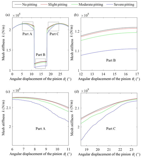 - Meng, F.; Xia, H.; Zhang, X.; Wang, J. A new tooth pitting modeling method based on matrix equation for evaluating time-varying mesh stiffness. Eng. Fail. Anal. 2022, 142, 106799. [Google Scholar] [CrossRef]