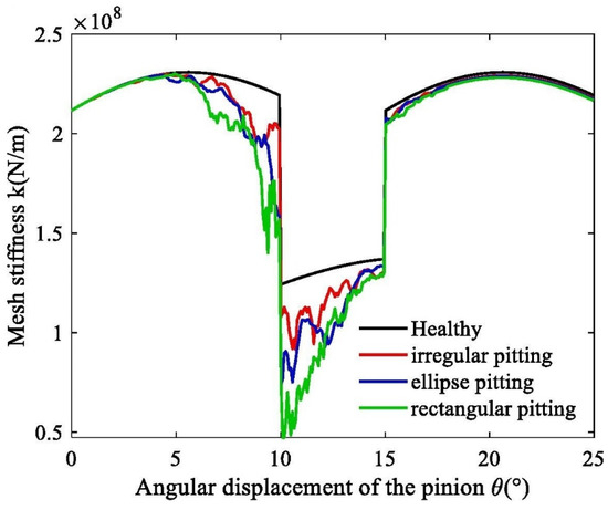 The time-varying mesh stiffness can then be obtained. Figure 9 shows the TVMS for different degrees of pitting as described in [44]. The TVMS diagram showing the fault state of different pitting shapes detailed in [56] is shown in Figure 10. From the diagram, the adopted shape of the pit affects the value of TVMS. Irregular pitting is closer to the healthy state which means that the modelling of the regular shape reports a scenario that is worse than the actual condition of the gear teeth with fault. It also shows that pitting reduces the TVMS and each pit on the tooth drops the value of the stiffness according to its severity as shown in the several downward spikes on the curve.