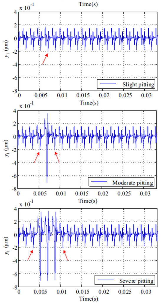 The evaluated mesh stiffness is input in the mathematical models to obtain the dynamic response of the pitted system. The displacement signal of a pitted gear system in the time and frequency domain, as presented in [45], is shown in Figure 11 and Figure 12. It can be observed that the spikes on the time domain increase with fault severity as shown by the red arrow. In the frequency domain, the frequency amplitude increases, and the sidebands also increase with pitting severity.