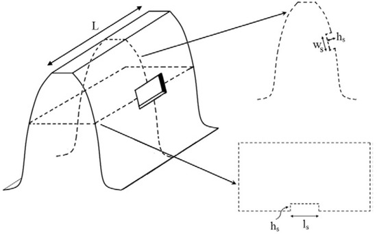 Spalling in gears has been modelled with surface areas that are rectangular [42,58,59,60,61,62,63,64,65,66], circular [42,67], V-shaped [42], elliptical [59,68], the shape of a keyway [69,70], spherical [71], and shaped as an ellipsoid [72,73]. The models usually consider a single spall on the pinion [42,58,59,68,69,70,72,73]. However, spalling may occur on multiple teeth for gears in operations. Research in [67] studied multiple spalls on one tooth and double tooth spalls. Spalling on gears in operations are usually irregular in shape, this has only been modelled by FEM as described in [74]. Figure 13 shows a gear tooth with a rectangular spur as presented in [42].