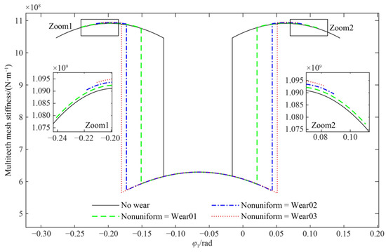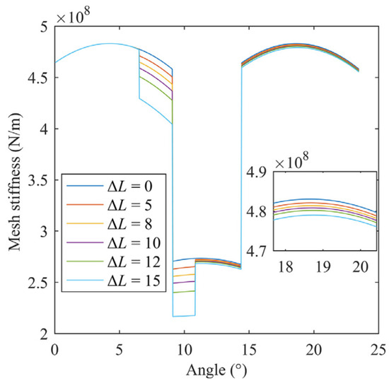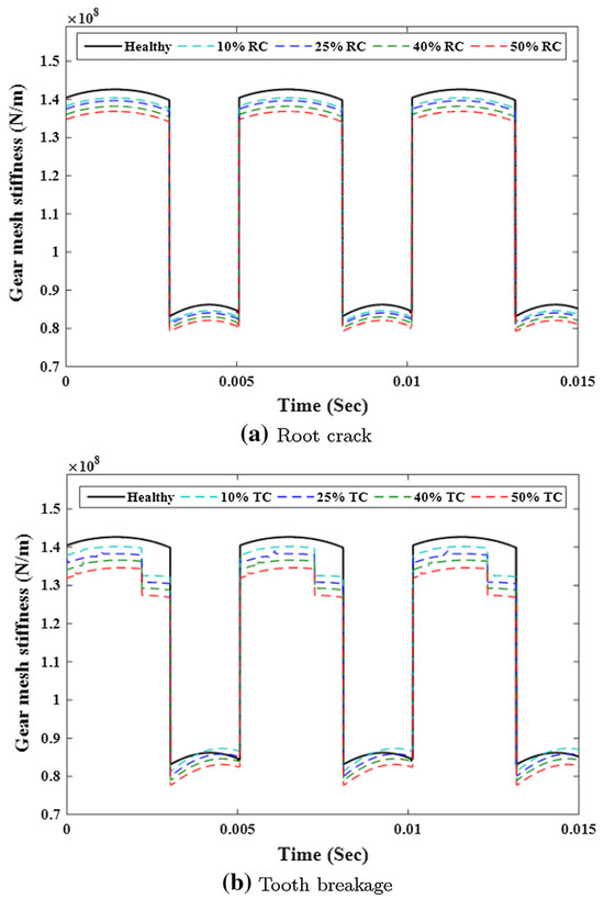 where Ls, Is, and As represent the length, area moment of inertia and area of the spalled region. All parameters in Equations (21)–(23) are shown in Figure 3 and Figure 13. Figure 14 shows the TVMS of a gear system with spalling on the pinion as detailed in [75]. It is observed that there is a regular dip corresponding to the fault. The more severe the fault the more the dip from the healthy curve.