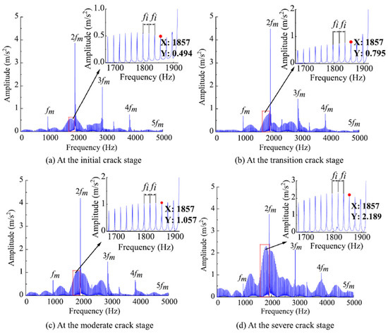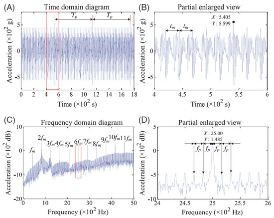 Figure 15 is as presented in [70]. Figure 15A–D show the effect of spalling in the time and frequency domain. Figure 15B,D are enlarged views of the regions marked in red in A and C, respectively. The time domain shows increased amplitude in the region of the spall and the frequency domain shows an increase in sidebands.
